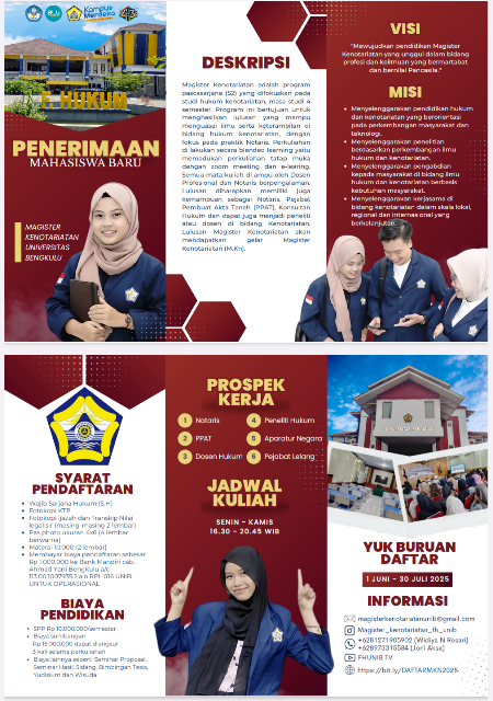 Saat ini Program Studi Magister Kenotariatan (MKn) Fakultas Hukum Universitas Bengkulu resmi membuka Penerimaan Mahasiswa Baru (PMB) tahun ajaran 2025/2026 mulai tanggal 1 Juni s/d 30 Juli 2025. Disampaikan Dekan Fakultas Hukum Dr. M Yamani Komar, S.H., M.Hum, melalui Ketua Prodi MKn Dr. Widiya N Rosari, S.H., M.Hum kepada curupekspress.com selain lulusan menjadi Notaris dan PPAT, lulusan Magister Kenotariatan diharapkan memiliki juga kemampuan sebagai Konsultan Hukum dan juga menjadi peneliti atau dosen di bidang Kenotariatan.